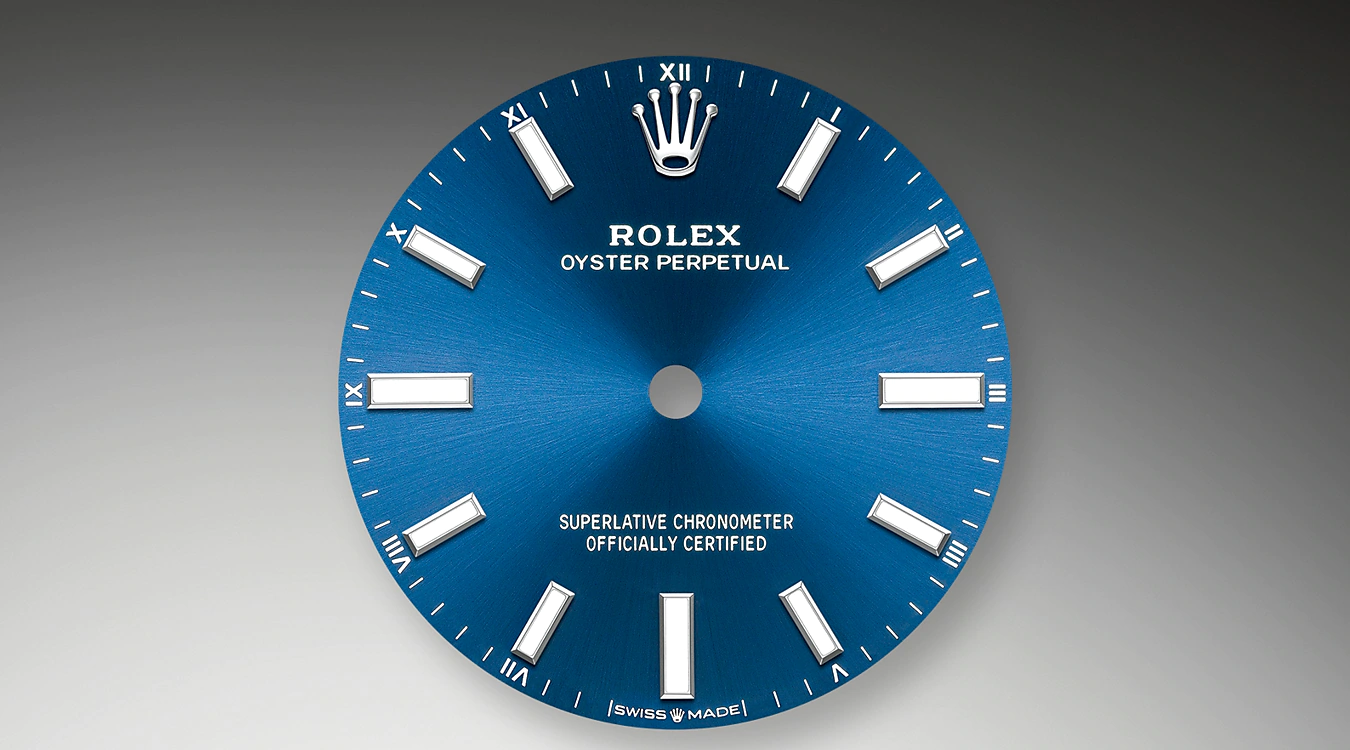 サンレイ仕上げは、オイスター パーペチュアルコレクションの多くのダイアルに繊細な光の反射をもたらす。これはダイアルの中心から外側に向かって溝を作る、熟練のブラッシング技術によるものだ。光はそれぞれの彫りに沿って均一に拡散され、手首の位置に応じてわずかに動く、特徴的な輝きを生み出す。